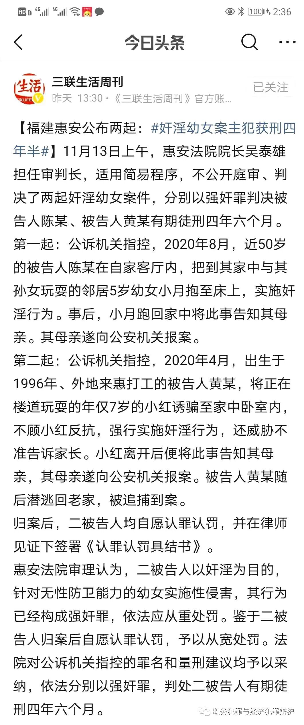 根据媒体报道,11月13日上午,惠安法院适用简易程序,不公开庭审理、判决了两起奸淫幼女案件,分别以强奸罪判决被告人陈某、被告人黄某有期徒刑四年六个月。