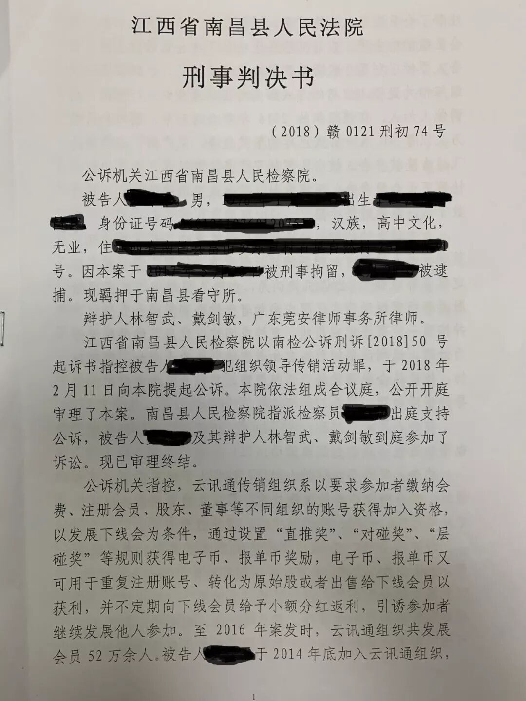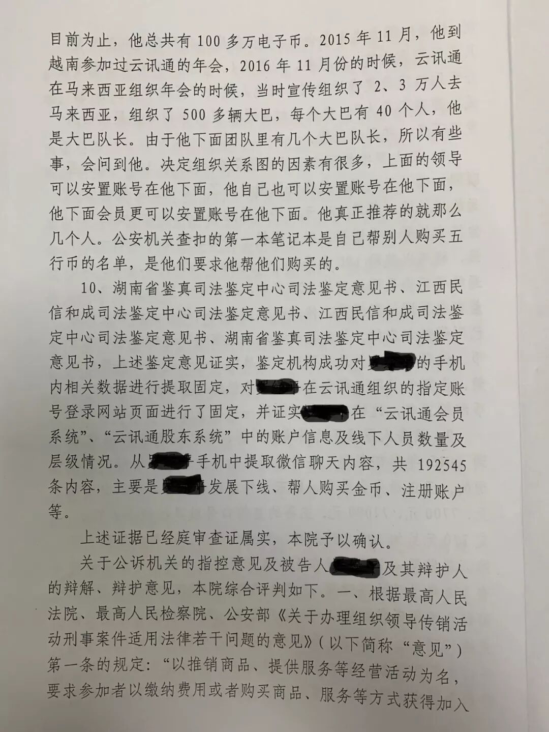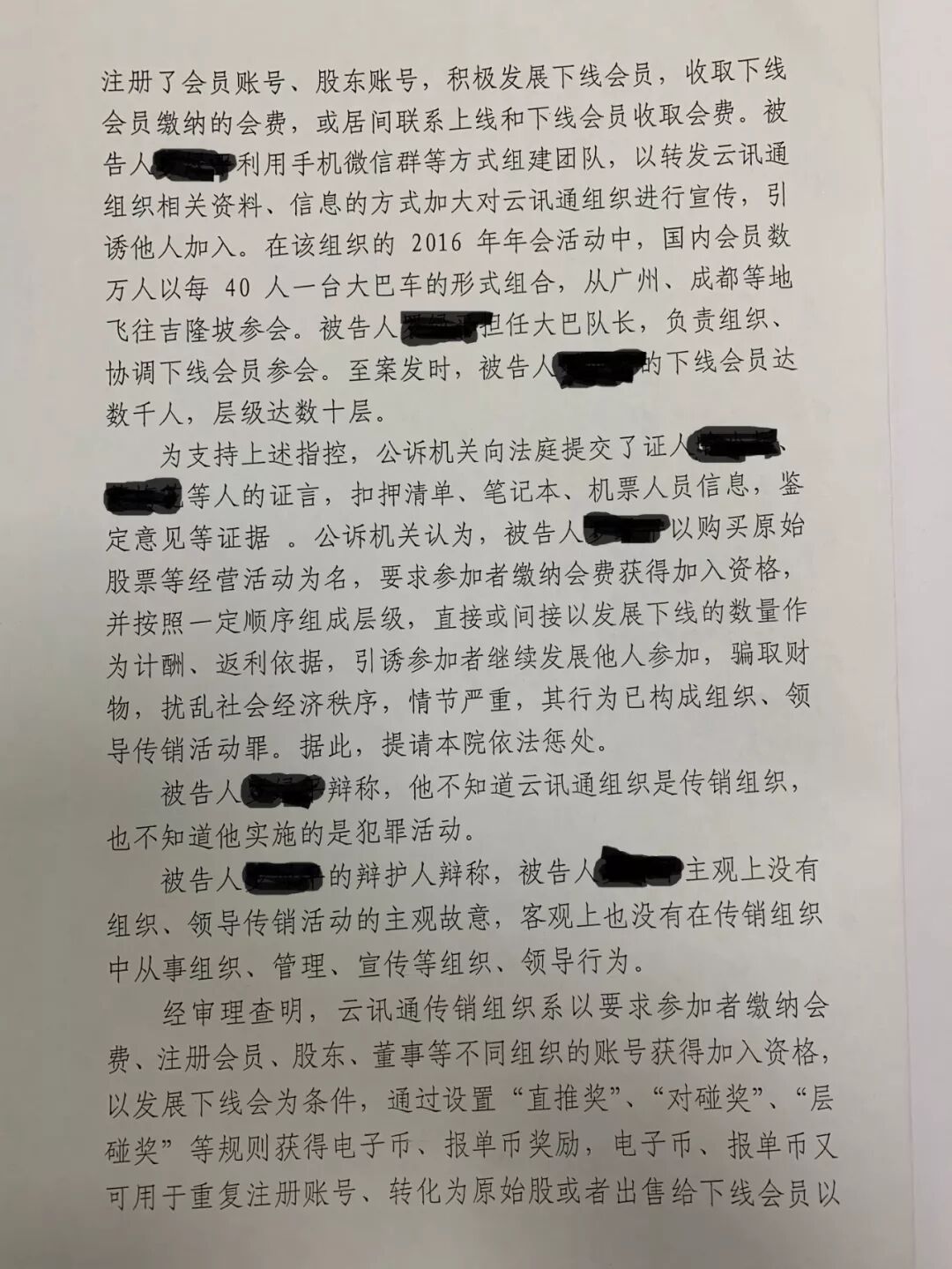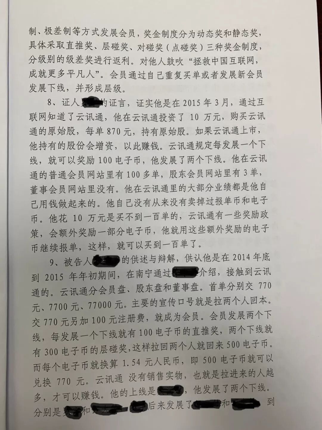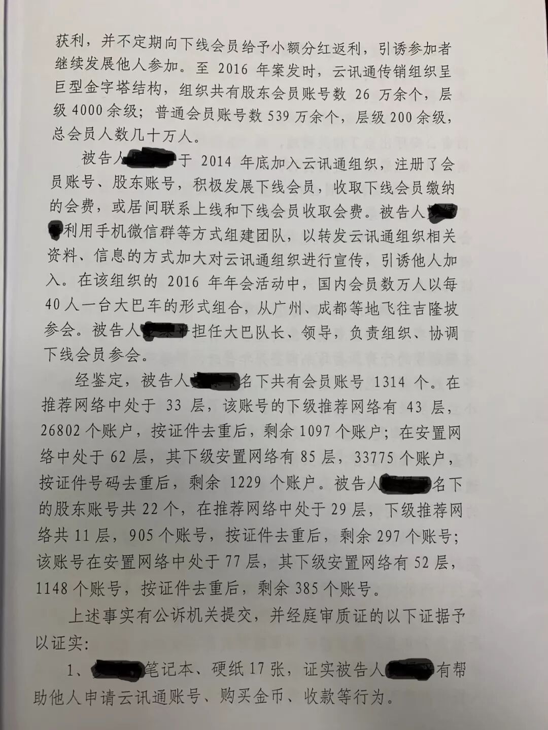 云讯通组织在中国发展会员截止2016年案发时,已达52万余人,该公司的总部以及上层在马来西亚。该组织以发展下线为条件,通过设置“直推奖”、“对碰奖”、“层碰奖”等规则获得电子币、报单币奖励,电子币、报单币又可用于重复注册账号、转化为原始股或者出售下线会员以获利,并不定期向下线会员给予小额分红返利,引诱参加者继续发展他人参加。