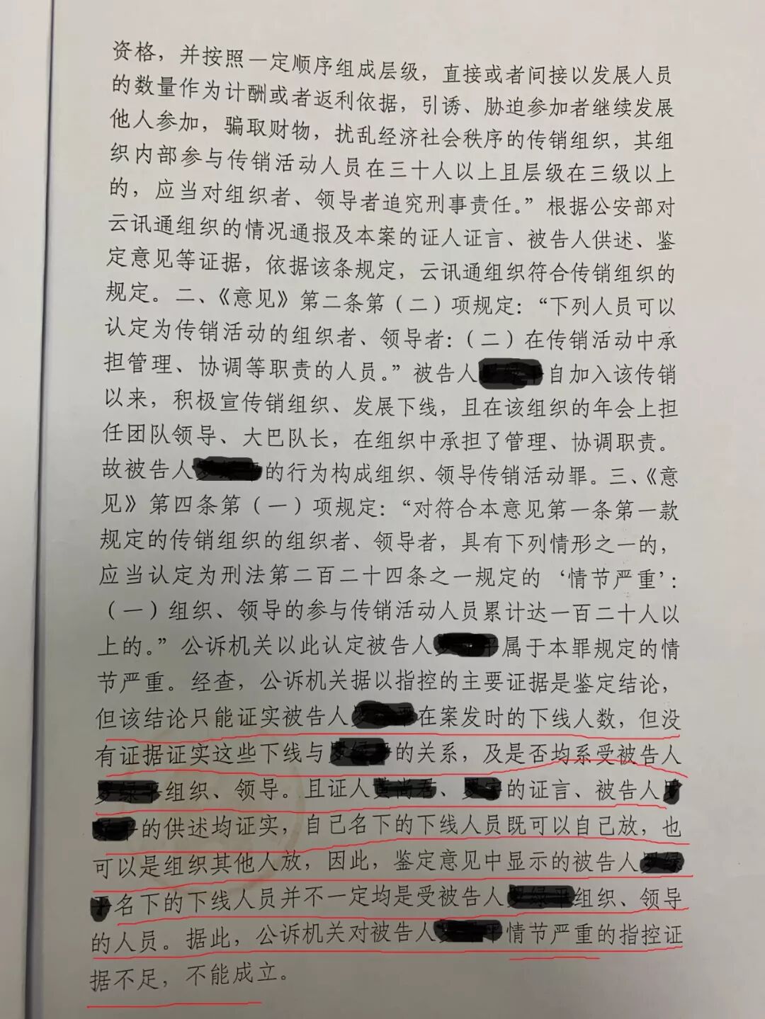 综上,本律师认为刑法处罚组织领导传销活动罪的对象为领导者、组织者、宣传者及对组织扩大起着关键作用的人。罗某的角色在“云讯通”中是一个中等层级,不属于组织、领导传销活动罪打击的对象。所以应当对其宣告无罪。