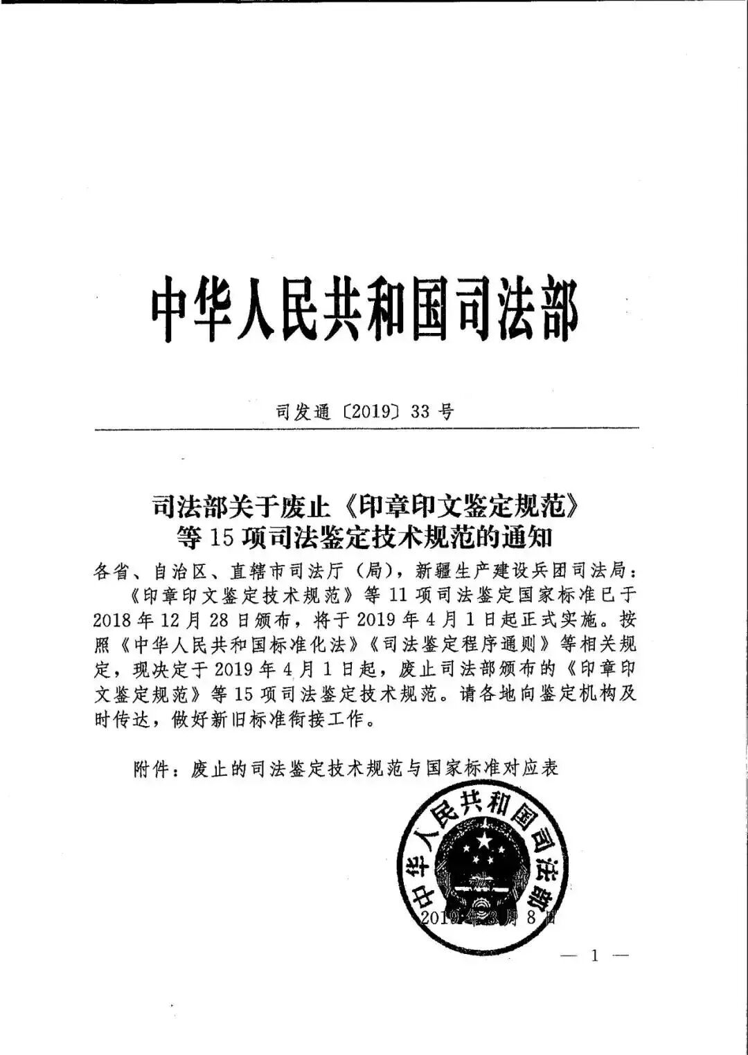《印章印文鉴定技术规范》等11项司法鉴定国家标准已于2018年12月28日颁布,将于2019年4月1日起正式实施。按照《中华人民共和国标准化法》《司法鉴定程序通则》等相关规定,现决定于2019年4月1日起,废止司法部颁布的《印章印文鉴定规范》等15项司法鉴定技术规范。请各地向鉴定机构及时传达,做好新旧标准衔接工作。
